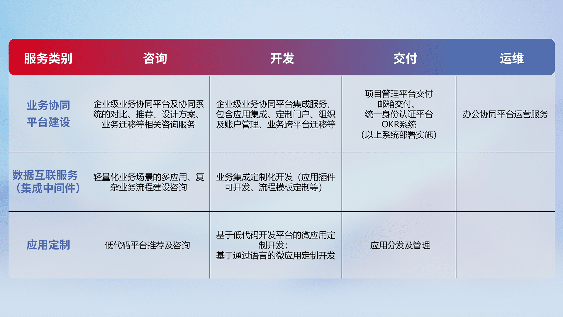 针对钉钉、、、企微、、、、IDaas等平台级产品提供产品的规划、、、、方案、、、交付、、定制化开发等服务,,,,实现如统一协同办公、、、、智能客户服务、、、、混合会议管理、、智能数据查询、、、、等业务场景,,,实现数字化转型。。。